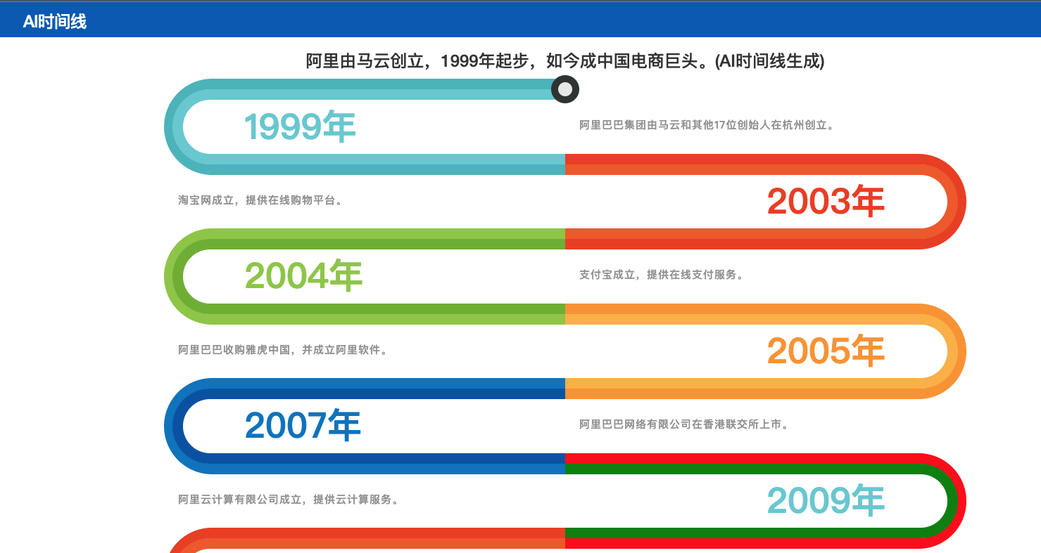 根据关键词生成时间线,前端作者利用 html+css+jquery,后端 java。 产品地址:http://www.ai-timeline.top/