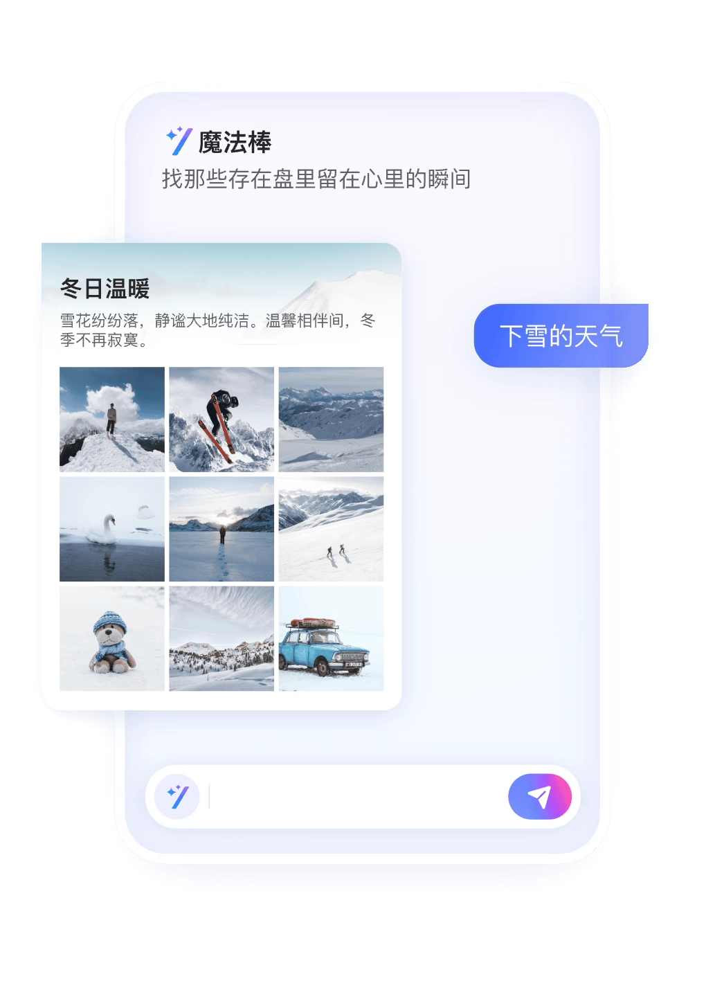 根据阿里云盘的描述,可以向魔法棒发送图片描述信息,魔法棒会自动找出存储空间里符合描述的图片,方便查找回忆。也可以向魔法棒发送视频,让魔法棒总结视频内容。可以更方便地使用云存储软件。
