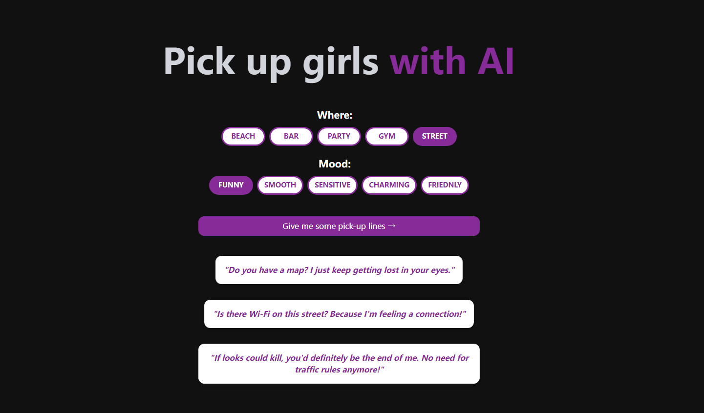 AI搭讪语句生成,选择场合和语气,即可自动生成对应的搭讪语句。