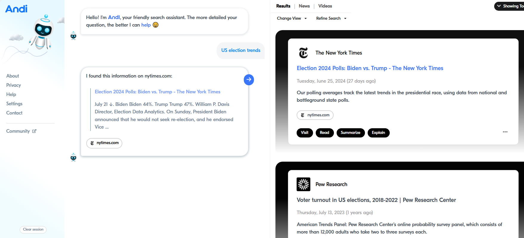 “Andi”是一款AI问答助手,发送问题之后他会自动搜索网站并回答你的问题,并告知资料来源。网站支持中文,但有些问题无法理解,推荐使用英文发送问题。