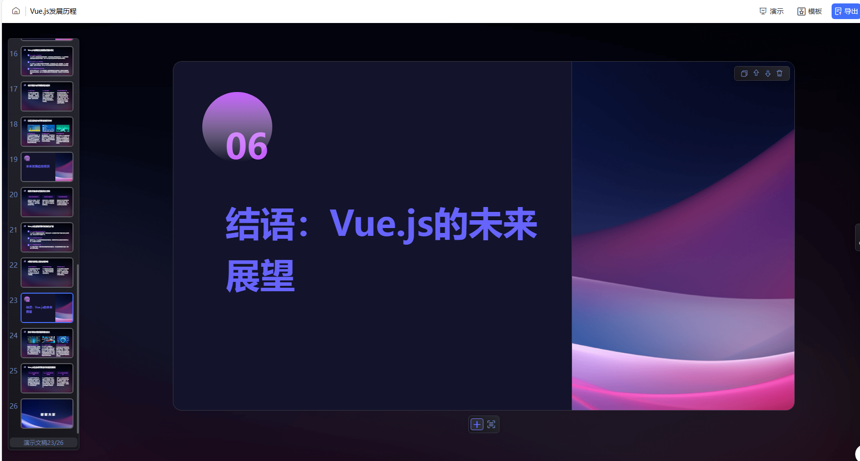 下面是根据“VUE发展史”自动生成的26页PPT。