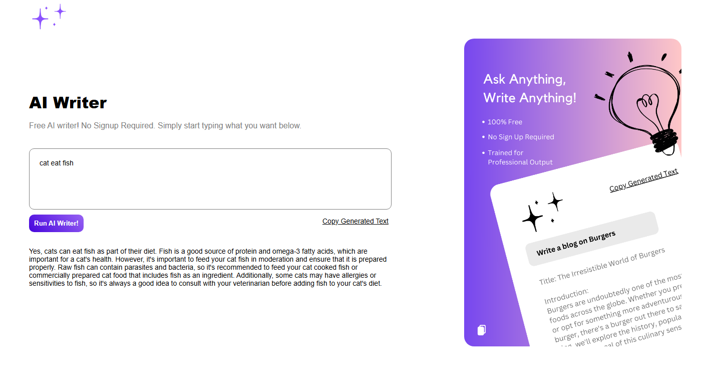 “AI Writer”是一个AI写作网站,输入一句话或自己的想法,即可自动生成一段文章。