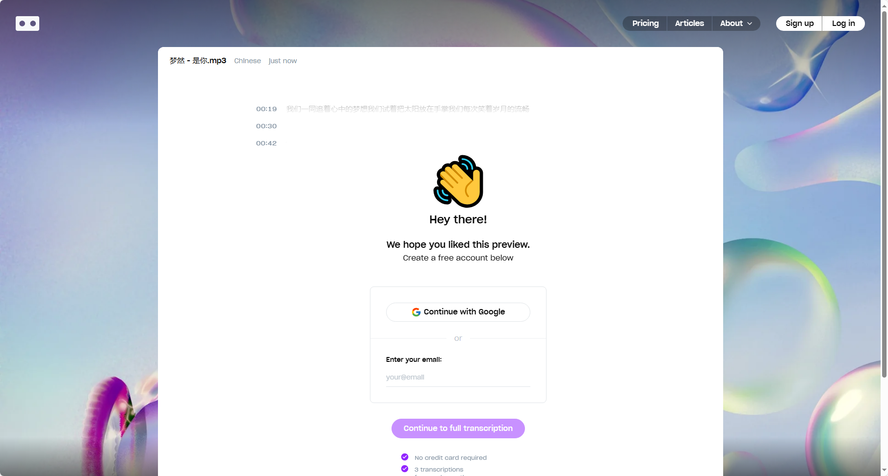 Good Tape是一种基于 AI 的自动转录工具,旨在有效地将录音转换为文本。(需要邮件登录才能查看转录文本。)上传音频文件,选择语言(支持中文),即可开始转录。