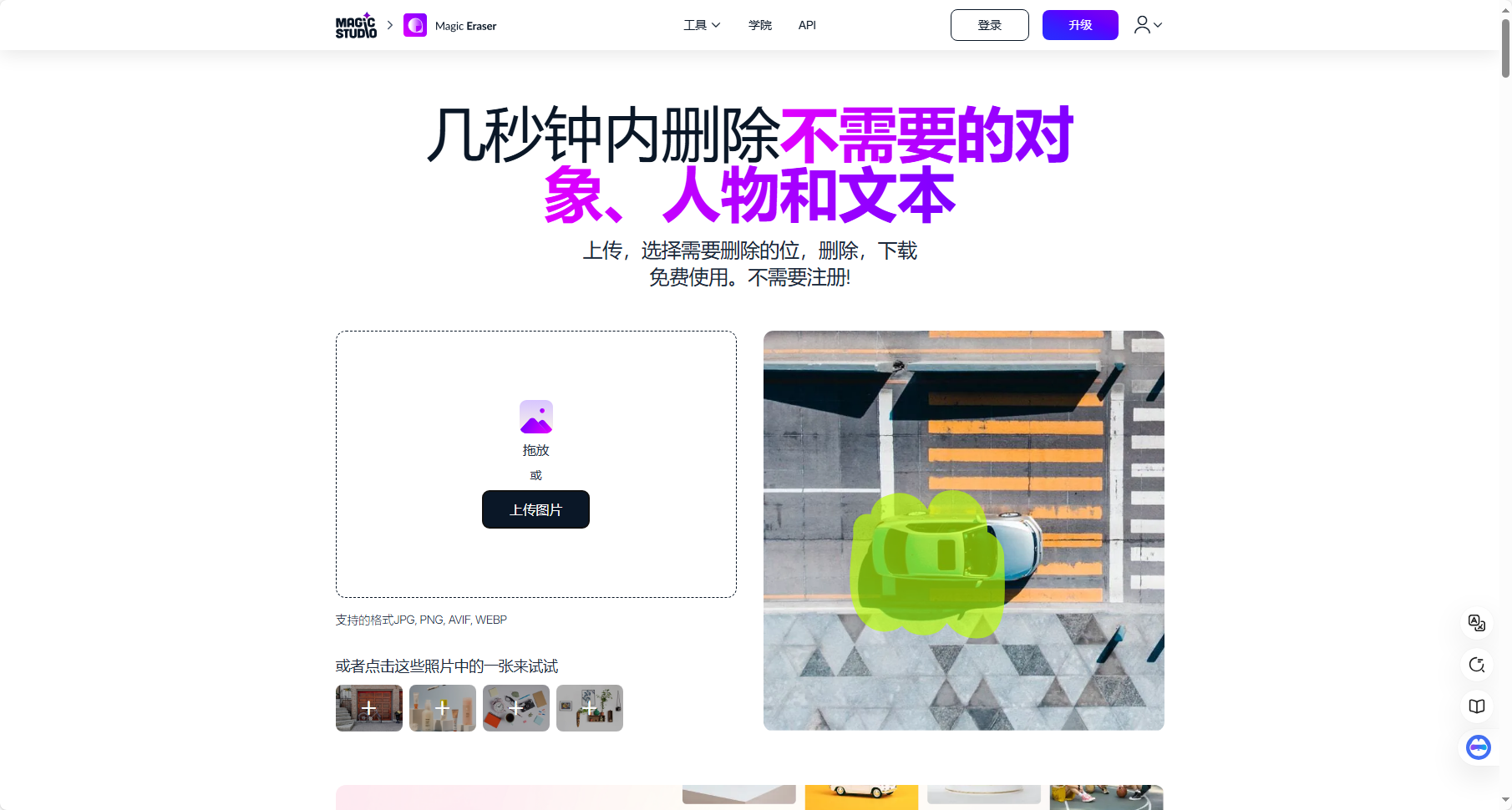 Magic Studio是一个集成式的AI图片处理网站,提供AI抠图,基于文本生成图片,图片放大等功能。下面是AI擦除的功能演示。